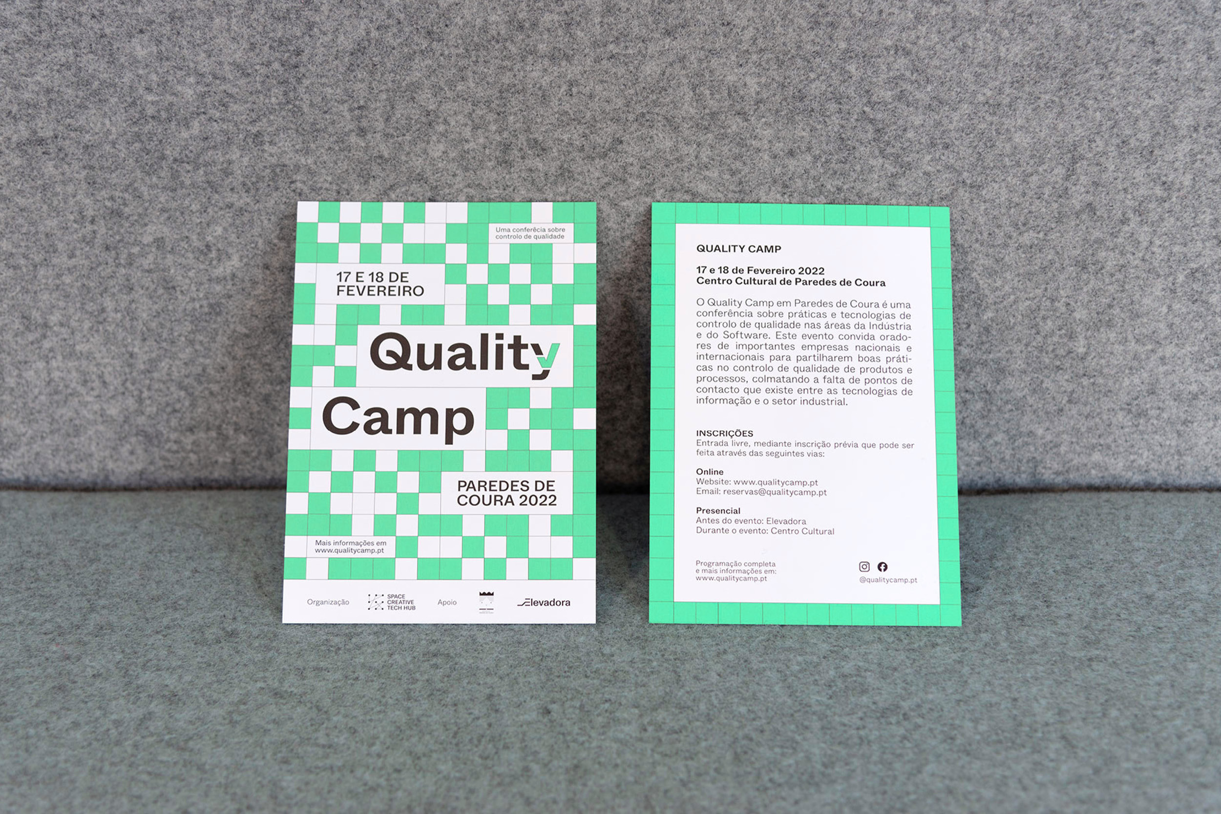 For all these reasons, the choice of green as the main color was quite obvious. Green, a representative of positivity, investment, and growth, was applied along with the various graphic supports that the event required. Like the color, the grid was also an element of enormous visual importance. Appealing to the organizational aspect that Quality Camp intends to encourage, the use of the grid served to explore one of the main concepts of this event. At the same time, the logo, as expected, is also a fundamental part of the project. The “Y”, discreet but bold, is presented with 2 cuts, which intend to refer to the “check” symbol, a visual element easily recognized as a symbol of quality.